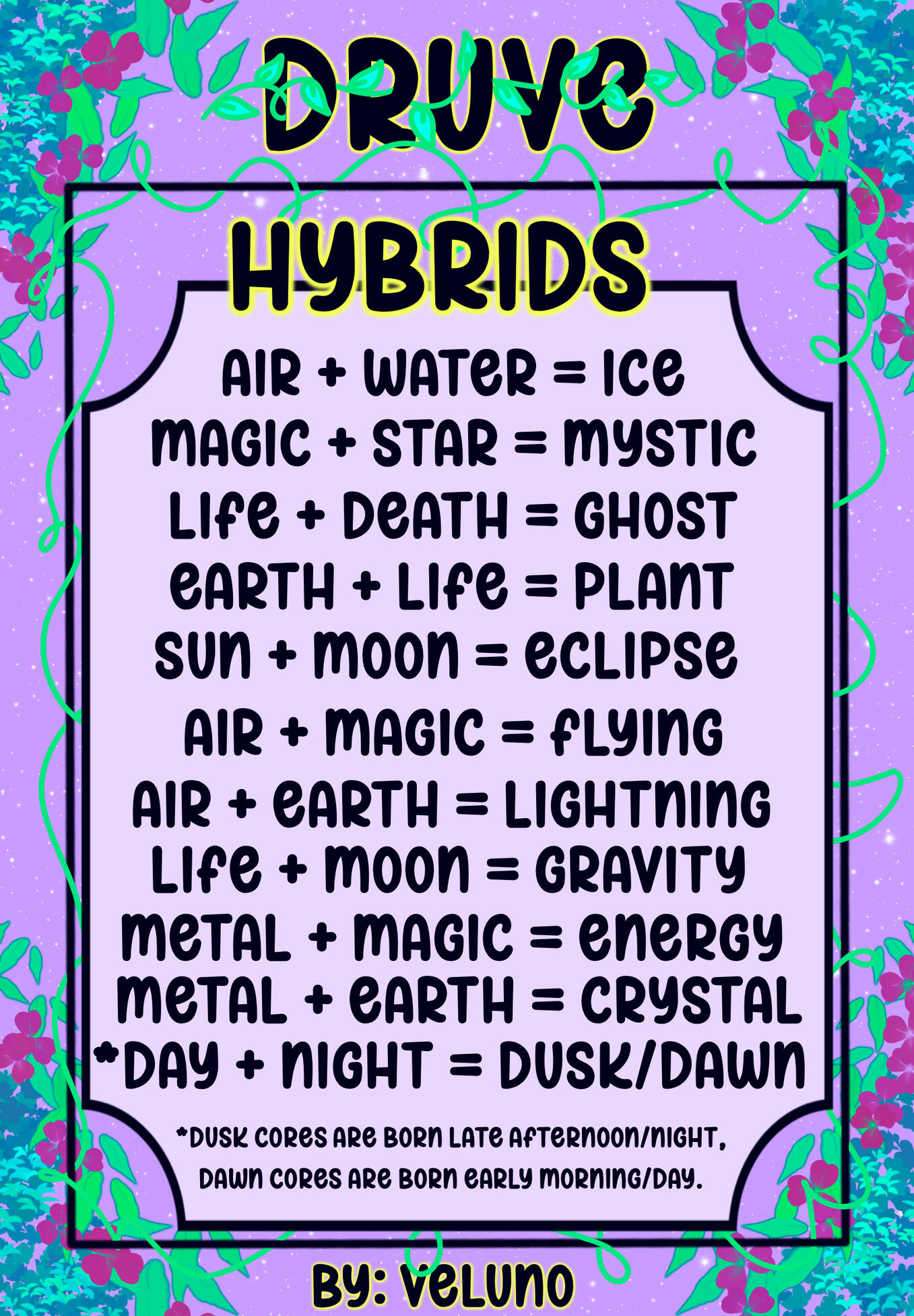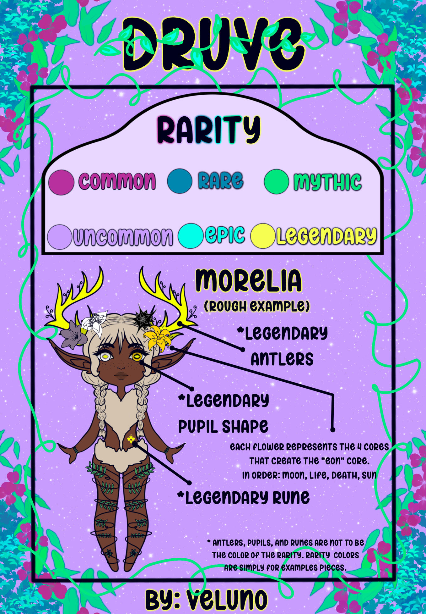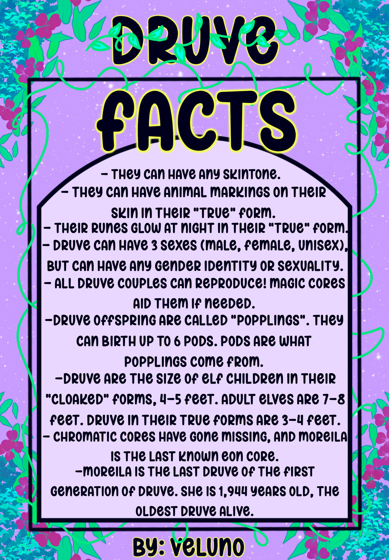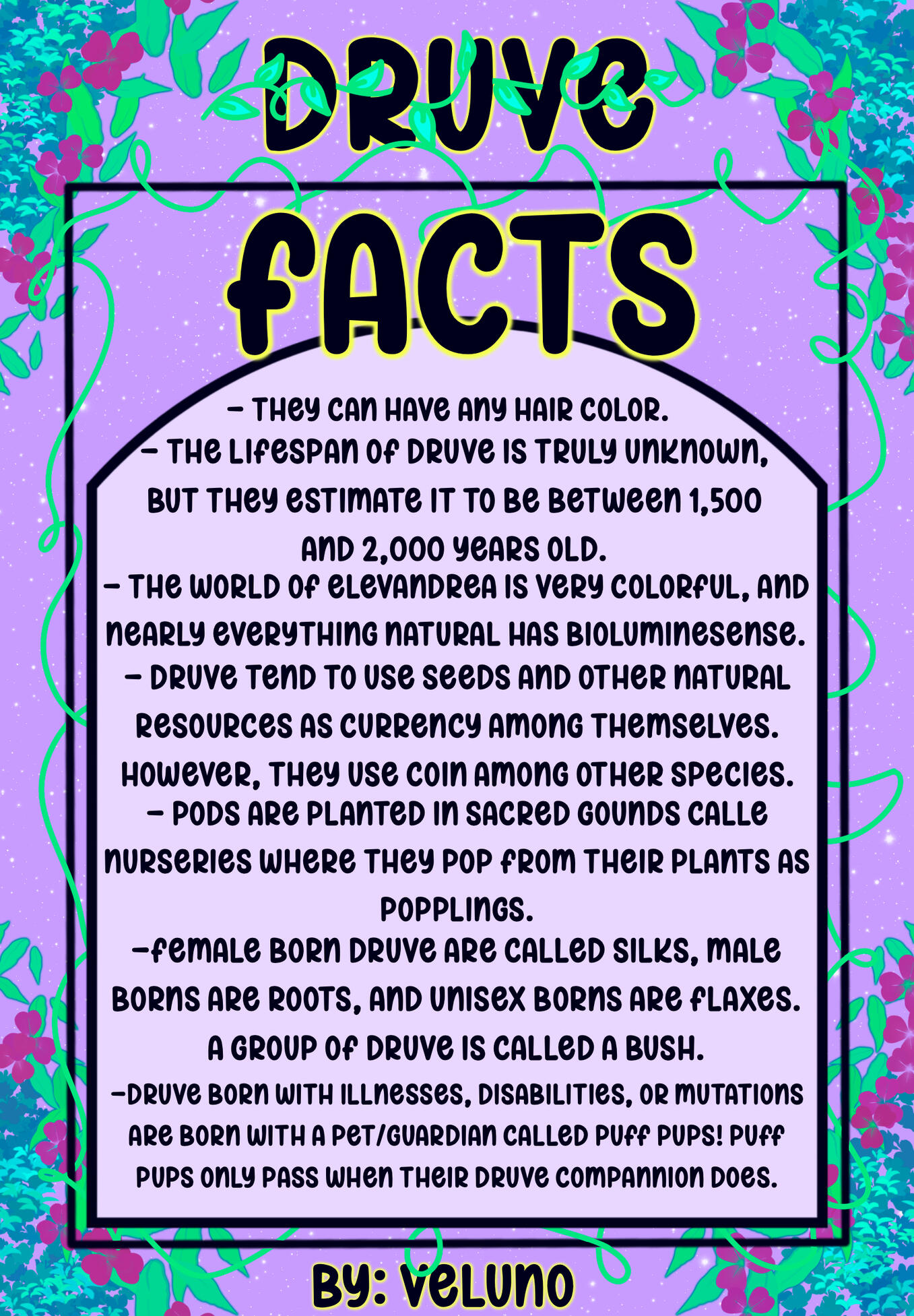 In the world of Elevandrea, there is a new species, the Druve. Druve are a species created hundreds of years ago, coming from the beautiful Dryads of the forest, the ever intelligent Druids, and the noble elves of the city. Long ago in Elevandrea, Dryads, Druids, and Forest Elves worked tirelessly to protect the forests of the land. However, humans and other species started attacking them, and the forests, to gain control, their magic, and to deforest the land for bigger cities. Dryads, Druids, and the Forest Elves would be used for their magic that was connected to the earth. Even murdered, using their essence to create potions and such to give magic to the other species. They were hunted so heavily, they needed help to protect the forests they love and call home.Leaders of the three species came together beneath a large oak tree hidden deep in the forest, said to be over five thousand years old. They took sap from this tree, and used the three of their magic to create a small pod, then planted it beneath the tree. Within a few months, the new species, they deemed them the name Druve, was born. They had the genetics of Dryads, Druids, and Forest Elves, but truly came from the earth.The Druve had two forms, a “true” form, and a “cloaked” form. True forms were them as they truly are, which consisted of having antlers, or horns, that grew beautiful leaves and flowers from different trees and plants, as well as animal markings, like a tiger’s stripes, or a fawn’s spots. The forms also had a thing they called a rune, somewhere on their body. These runes correlated with their cores, or core types. As they are part of the world around them, they have magic based around their cores. A few common examples are the four elements, fire, water, earth, and air. But there were many more cores, and new ones are discovered often. Their other form, the cloaked form, let them roam the cities, appearing as elf children. Their antlers, markings, and runes are all hidden by a special spell only they can cast. It keeps them safe from the species out there that wish to abuse them, as they abused the Dryads, Druids, and Forest Elves.The only species the Druve trust are elves, Dryads, Druids, and other nymph like creatures. These species have been taught to protect the Druve species that are their distant cousins, as they keep their forests alive.The Druve live in magically protected villages in the forest, cloaked and invisible to everyone, except the ones they deem worthy with the sight to see them. Their homes are built into and on trees, along with using magic to make homes and places out of mushrooms and other things at the roots of the trees, and underground. They are special creatures, and only a few have been captured in their history. The humans and such want them more than they wanted the Druve’s creator species but for now, they are safe among the trees they were born from. And each year, Druve travel across the world to their home tree the very first Druve was created from, to rejoice and celebrate their lives, and the ones before them.