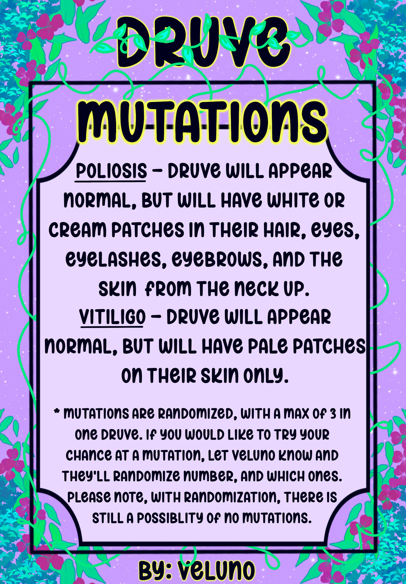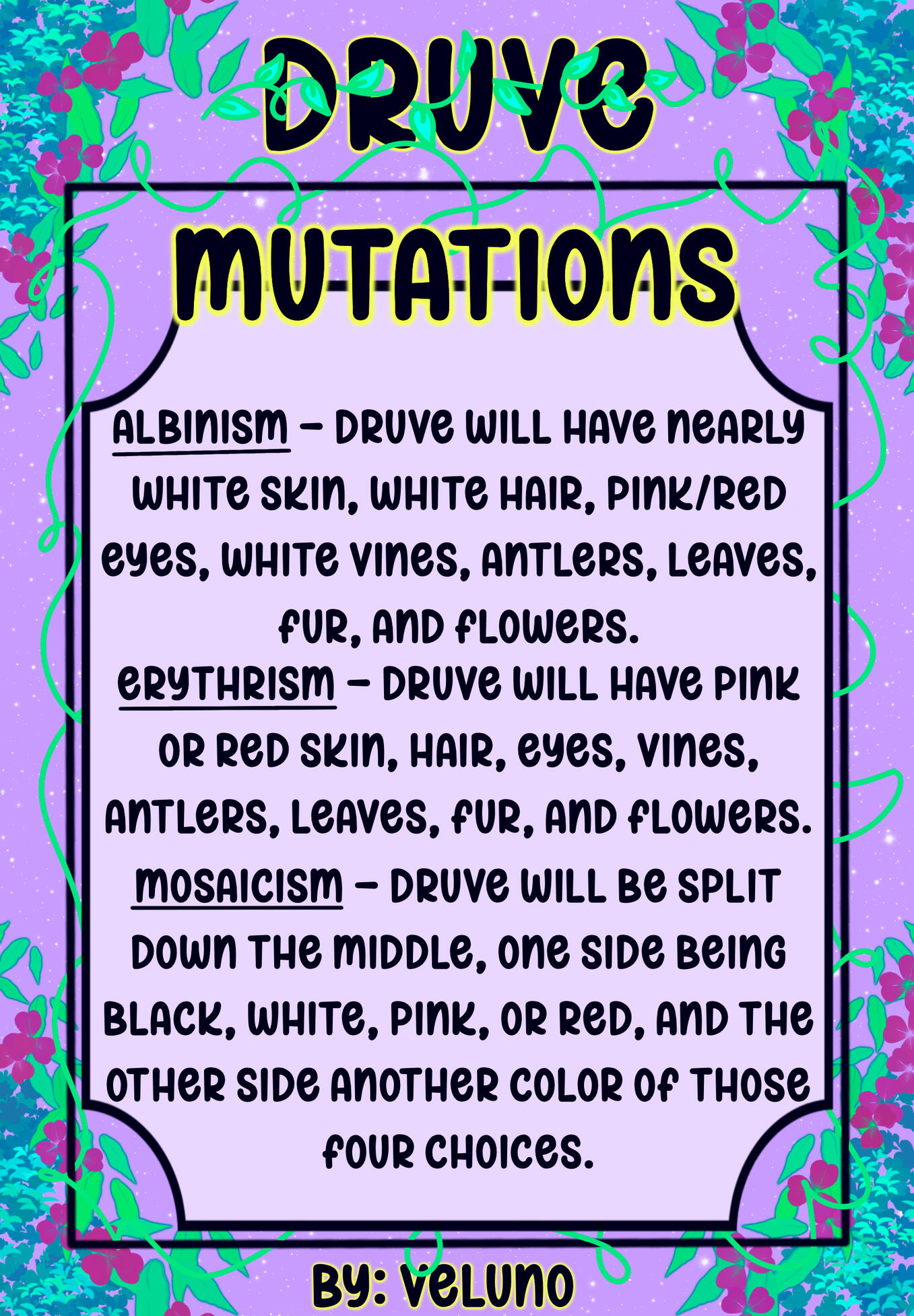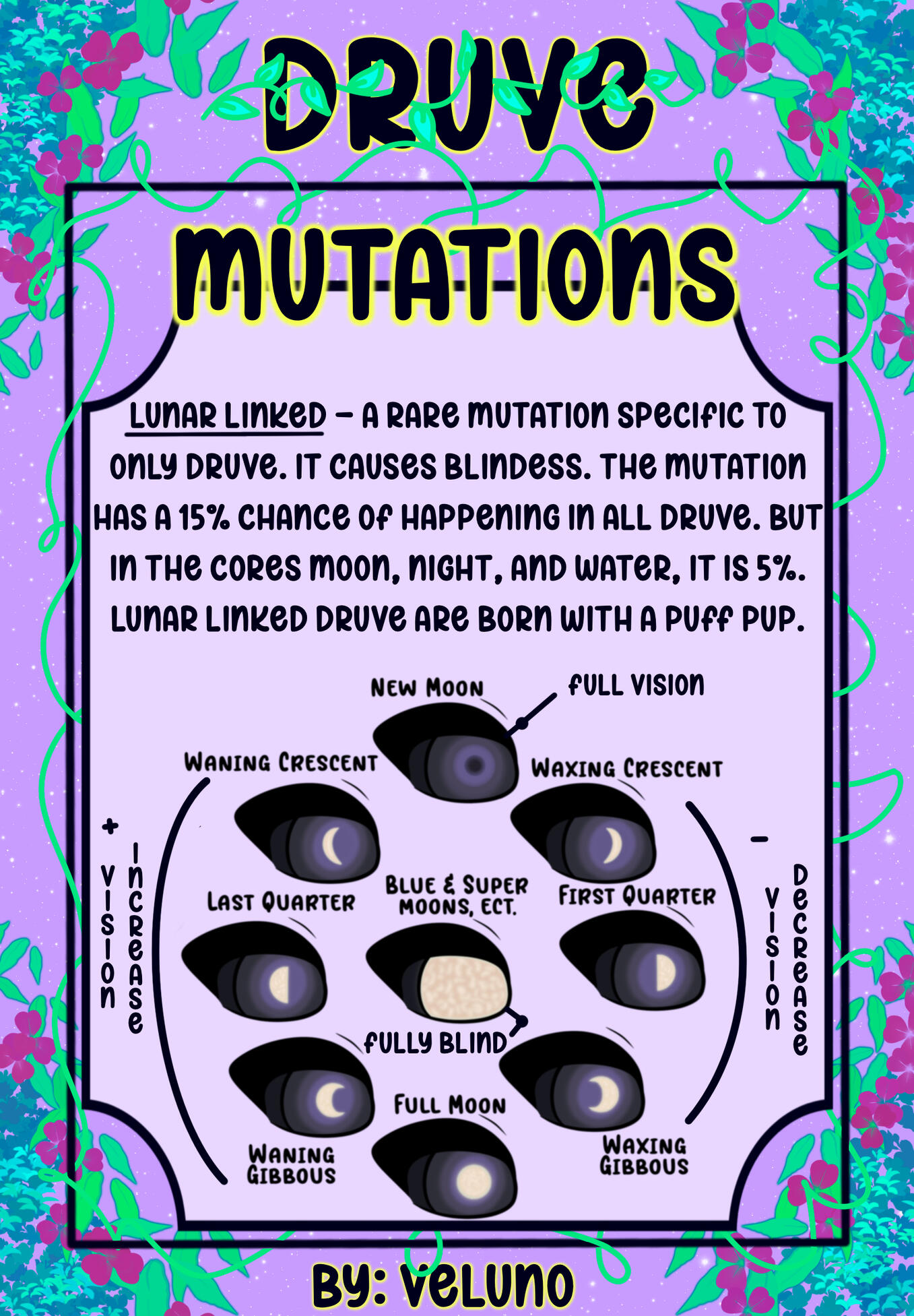 Welcome to the mutation called Lunar Linked. This can happen if a Druve is born under a full, blue, or supermoon. Its rare in all types, but especially rare in types like Moon, Night, Water, and these are just of what has been recorded thus far. There's no telling what other types this is even more rare for.When a Druve is Lunar Linked, their eyes take on phases of the moon. They follow it directly, meaning if its a waxing crescent for 4 days, their eyes will reflect this as well. Blue moons and supermoons result in the entire eye looking of that of a moon.And what happens when it starts to change? Blindness. New Moon is the only time they have full vision. The more of your moon you see, the less they can see. Full moon phase makes nearly entirely blind, only allowing them to see shadows. However, during blue and supermoons, they are completely, fully, blind. During Full and these other types of moons, the Druve with this mutation will often be taken care of and looked after by Moon, Night, and water types. The older they get the more they can do things on their own, but they'll always have a guide prepared. And each Lunar Linked Druve has a friend for their lifetime!They are called Puff Pups, they come from the same pod plants as the Druve itself was born from! They're little fluffy puff balls that are the size of a Druve's hand, growing with the Druve. Their guides help train the Puff Pups to aid them, and Puff Pups will bury themselves under the hand of their Druve, being held onto and guided during hard times of visiblity. Puff Pups carry around a pollen like powder that has a special smell only the Druve it belongs to can smell in helping them around too. And when a Druve passes, the Puff Pup will follow them to their grave and turn to dust atop them to join them in the afterlife.While the main sign of a Druve being Lunar Linked is their eyes, they have other signs as well! Their colors will always be muted and pale. And their colors will change as well! Where as a Druve can have light brown hair, it'll be muted, dull. But come time of a full moon their colors will change to nearly white. Blue moons? They turn a very pale shade of blue. And would you believe it if I said they turn a pale pink for supermoons?!This is a mutation, and while its beautiful in some ways, it does make the Druve's life harder. They haven't found a way to lighten it, or heal it, not even with magic. But they've found ways to help. Lunar Linked Druve are vulnerable, and they usually are never to leave the village. Because Lunar Linked is only in Druve, so if they're spotted by hunters, well.. You get the point. But do not fret if your Druve is born Lunar Linked, they will be desginated a guide right away, and have a little friend to grow and live with them!
